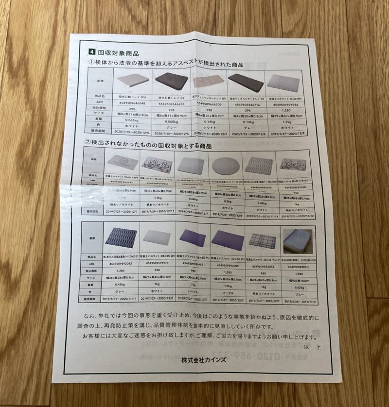 我が家で使用していたカインズ製のバスマットも、調べてみると「アスベストは検出されなかったが、安全のため回収対象」に分類されていました。