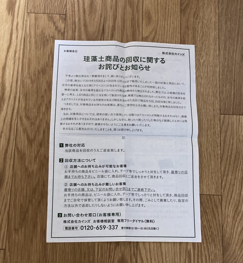 すると数日後、新聞の折り込みチラシに「珪藻土商品 回収のお知らせ」が入ってきたんです。まさかの現実に、コーヒーを吹き出しそうになりました。