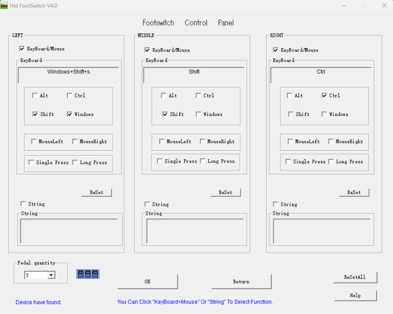 それぞれのペダルに割り当てて足で踏むだけで実行できます。